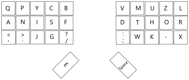 Malt<< Colemak | Frühere Tastaturbelegungen | QWERTZ >> ![]() Die von Lillian Malt in den 1970ern entwickelte Malt-Tastaturbelegung ist für die dafür speziell von Stephen Hobday gebaute ergonomische Tastatur ausgelegt. Die Malt-Tastaturbelegung sorgt dafür, dass die häufigsten Buchstaben und Funktionen einfach und bequem zu erreichen sind. Dafür wurden bei der zugehörigen Tastatur: